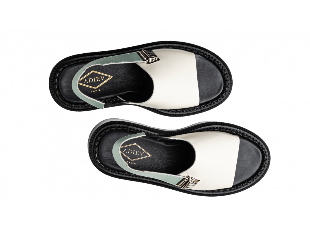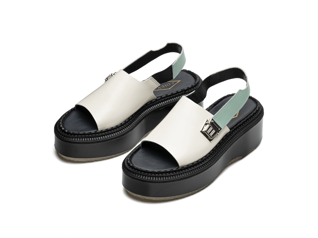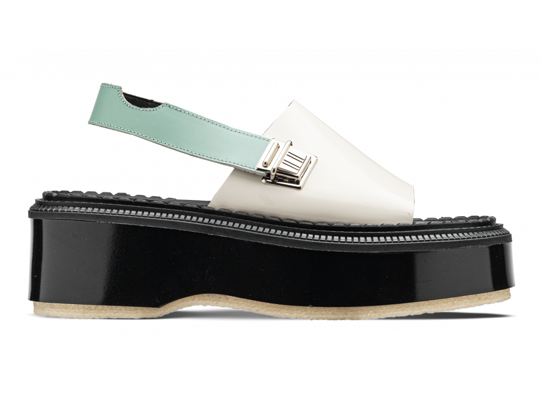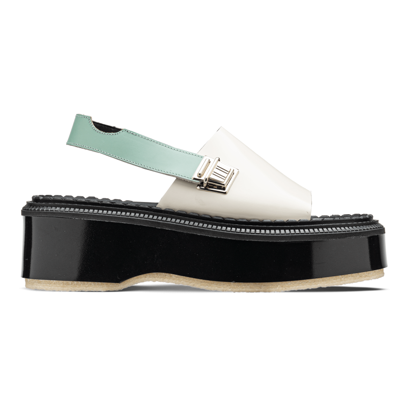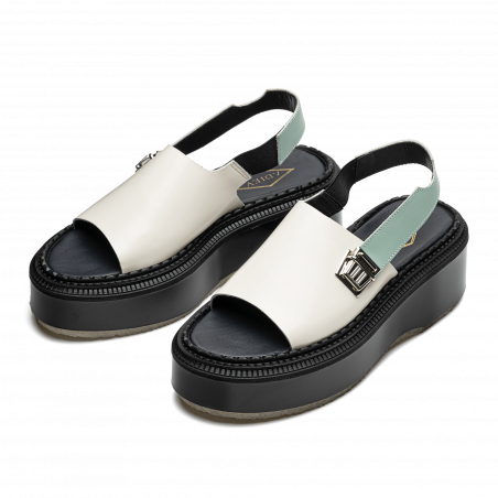Polished leather buckled sandal, covered wedge heel in leather and crepe sole