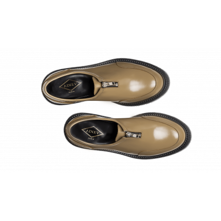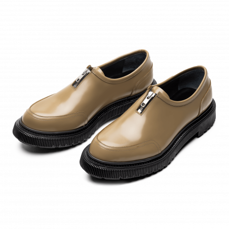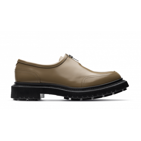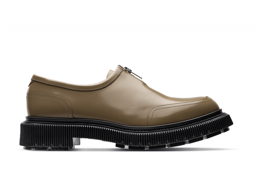 Polished leather zipper derby, injected rubber sole