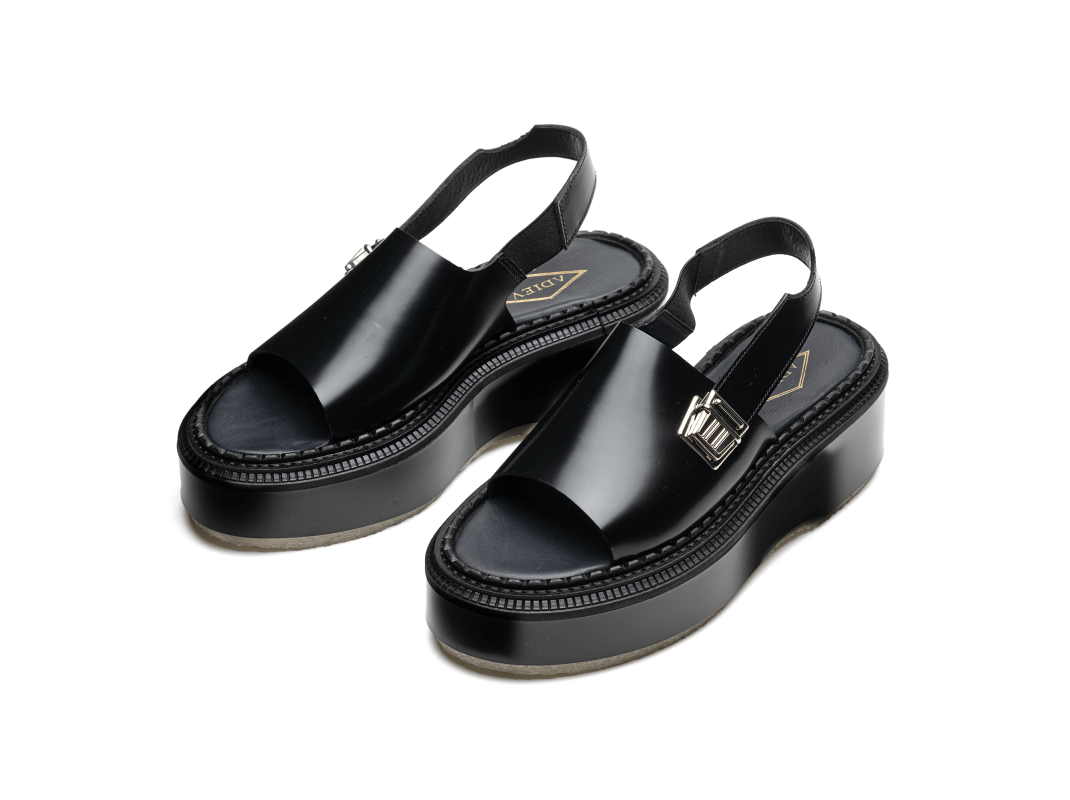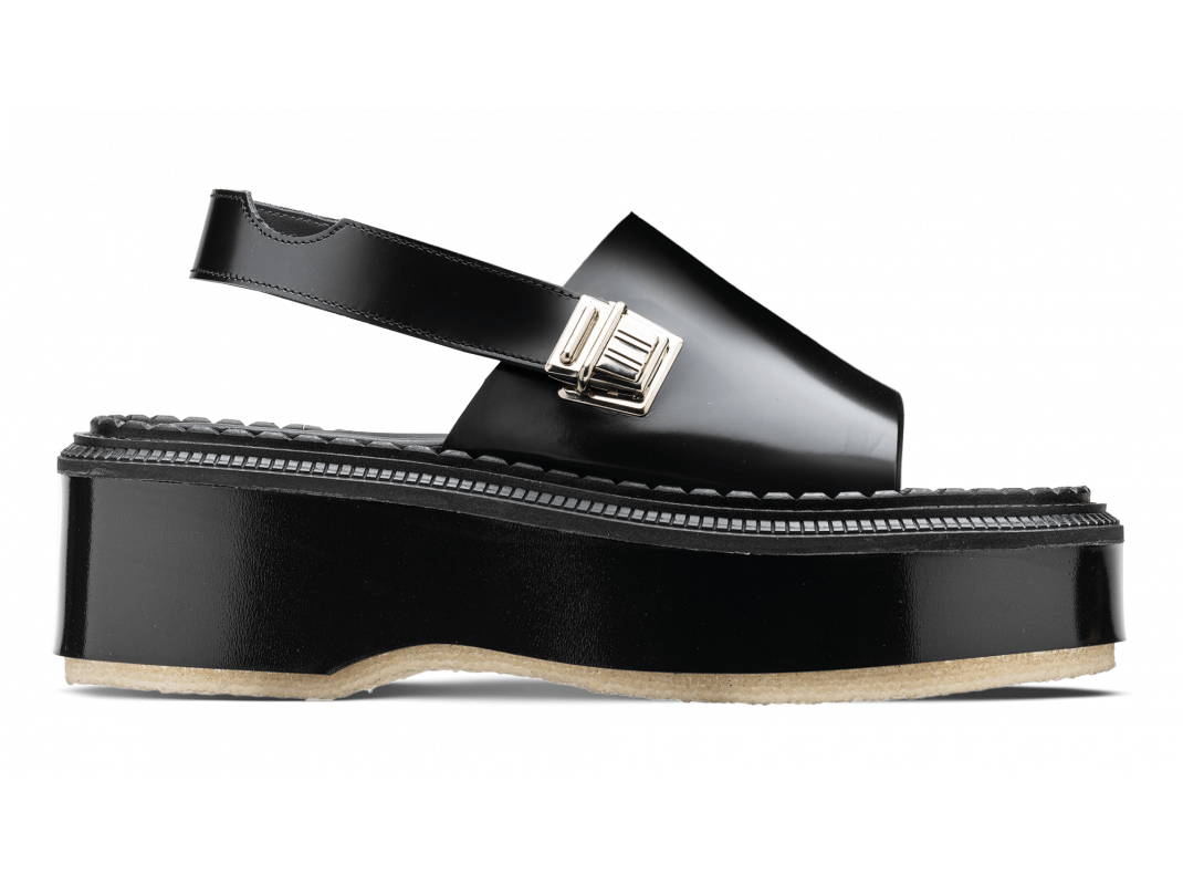 Polished leather buckled sandal, covered wedge heel in leather and crepe sole